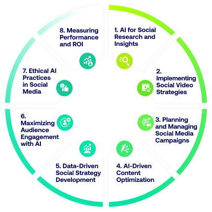 ↗Social Research with AI Tools↗Audience Analysis and Insights↗Creating Engaging Social Media Content with AI AI Tools for Text, Image, and Video↗Implementing AI-Enhanced Social Video Strategies↗Planning and Executing Social Media Campaigns↗Using AI Tools like ChatGPT, Canva, DALL-E, and Adobe Firefly↗Measuring and Optimizing Campaign↗Performance with Tools like Hootsuite and Buffer↗Video Analytics for YouTube and TikTok↗Building Social Media Strategies with AI↗Ethical and Strategic Use of AI
