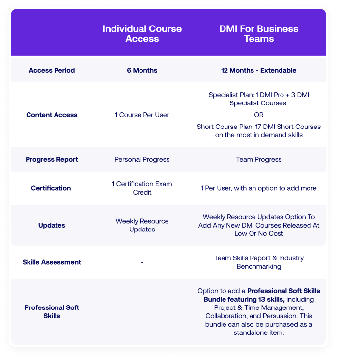 The Teams and Enterprise plans provide organisations with a DMI Business Membership Plan, including access to a broad catalogue of Courses, Learning Paths and more than 2000+ Resources. Enterprise Size Teams have access to; DMI's Skills Evaluation and Benchmarking Tool, greater flexibility of Course Library options, custom company-specific webinars and more.