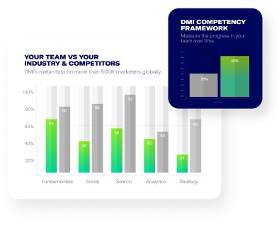 DMI's Skills Evaluation and Benchmarking tool allows you to get a detailed judgement-free assessment of the knowledge and capabilities of your team. Understand how your team compares by role, market, team, and business unit. Compare your team to the wider Marketing Industry and also companies in your category. Map your present skills to strategic goals to uncover training needs.